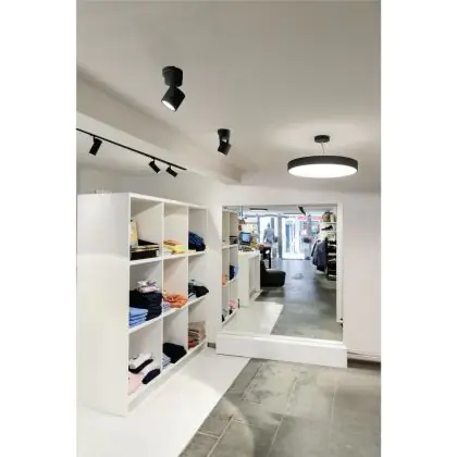 A fixture with a tiltable design makes it possible to direct the lighting specifically at an object or surface. This can play a particularly important role in shops (putting a new collection in the spotlight) or galleries (accentuating works of art). It can also influence the purchasing behaviour or interpretation of visitors.